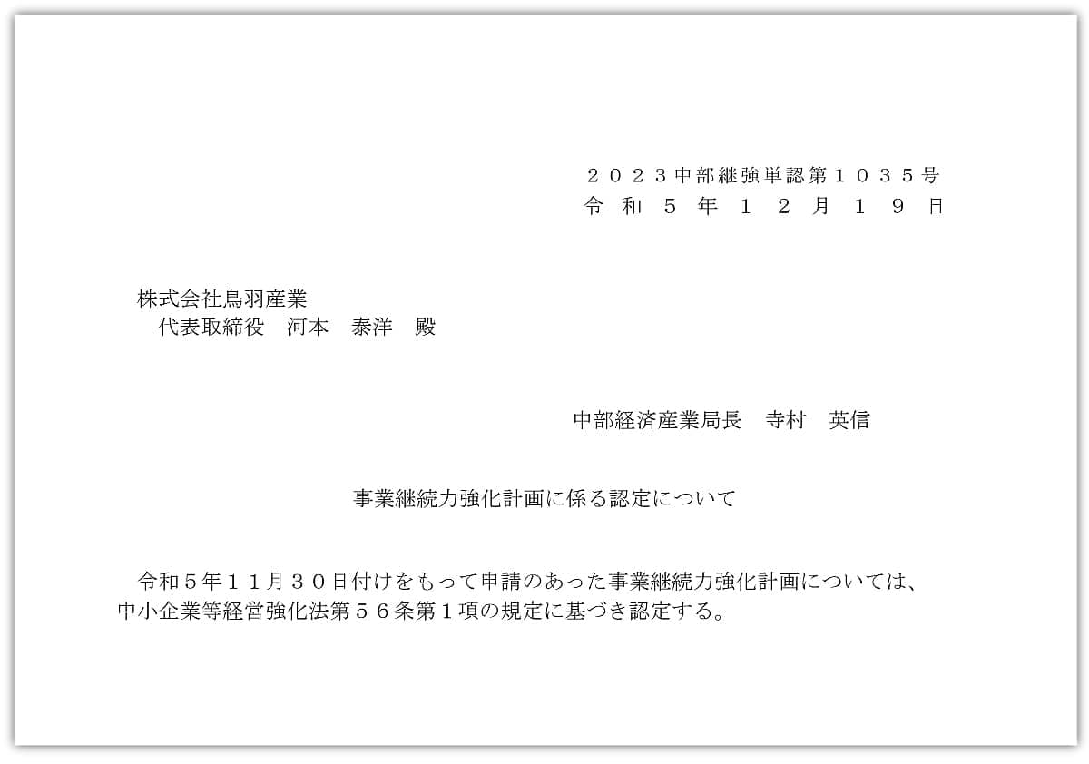 中小企業等経営強化法第56条第1項の規定に基づき、令和5年11月30日付で関東経済産業局より「事業継続力強化計画」の認定を受けました。