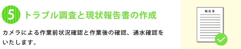 テレビカメラによる管内検査・管内閉塞状況。劣化状況、器具排水試験によるトラブル調査と状況報告書の作成
